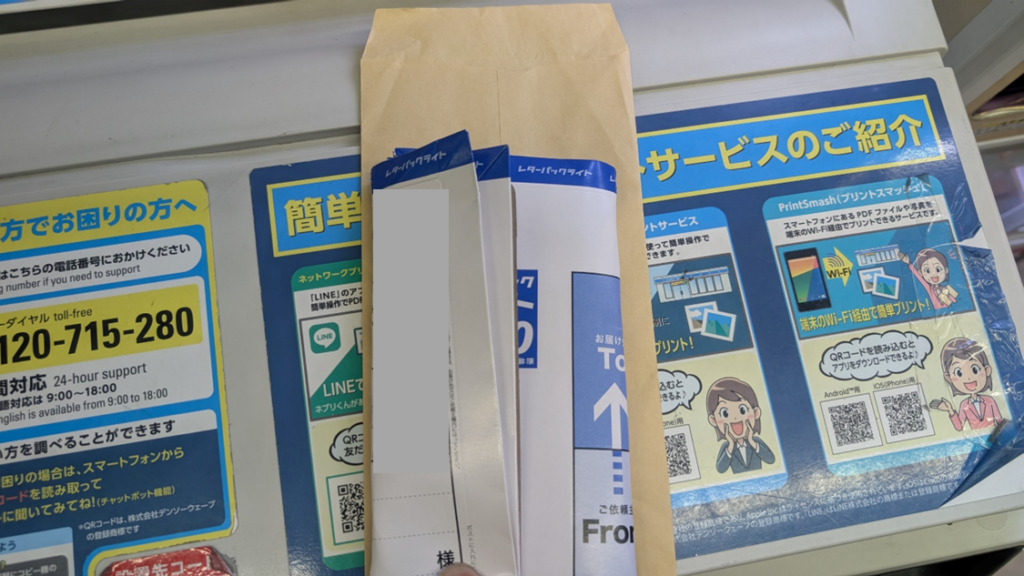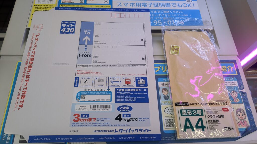 • 郵便局:レターパックライト(430円)1つ、レターパックを送るための切手180円分を購入