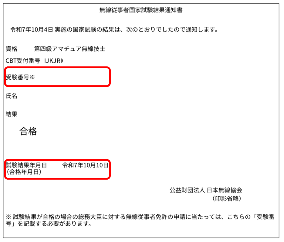 合格していれば、結果通知書に記載の受験番号と試験結果年月日(赤枠の部分)を控えて、無線従事者免許(従免)申請へ進みます。