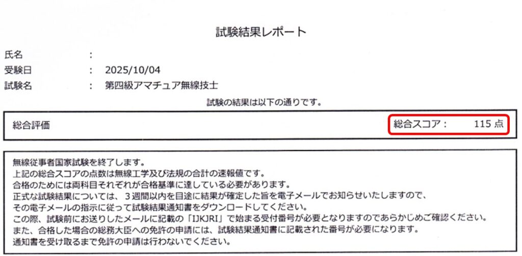 ちなみに、第四級アマチュア無線試験では合計点数が100点以上だと合格確定、80点未満だと不合格確定です。