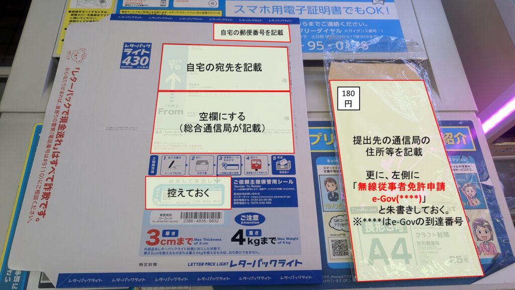 • 無線従事者免許証を返送してもらうための返信用封筒(自分の場合はレターパックライト)を、提出先の総合通信局へ送付する。
