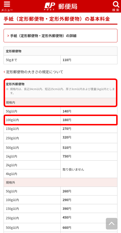 • (四つ折りのレターパックライトが入る定形外規格内の)封筒:約50円