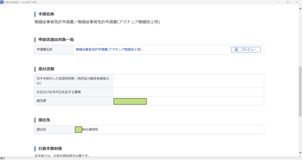 • e-Govで無線従事者免許申請(アマチュア無線)を選択して、必要事項を記入する。