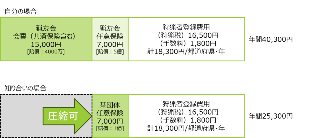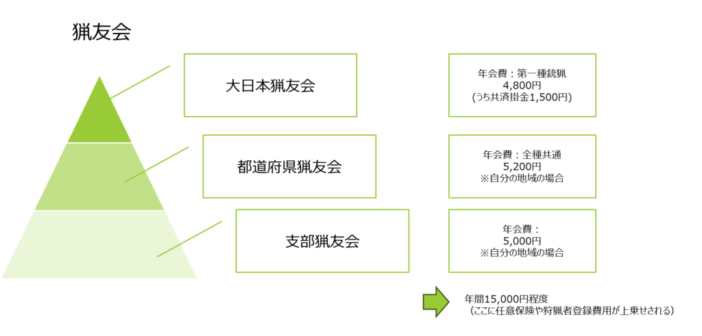 大日本猟友会+都道府県猟友会+支部猟友会の年会費(共済保険込み)で約15,000円、任意保険が約7,000円。
