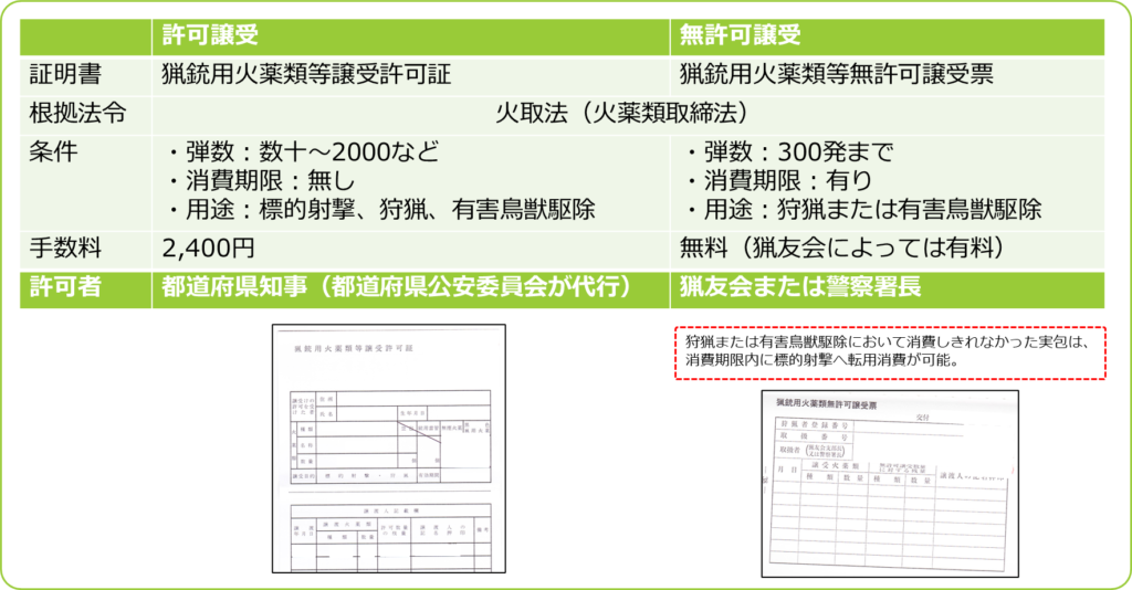 ここで、都道府県公安委員会(警察)が出す許可譲受と、猟友会が出す無許可譲受を比較してみましょう。